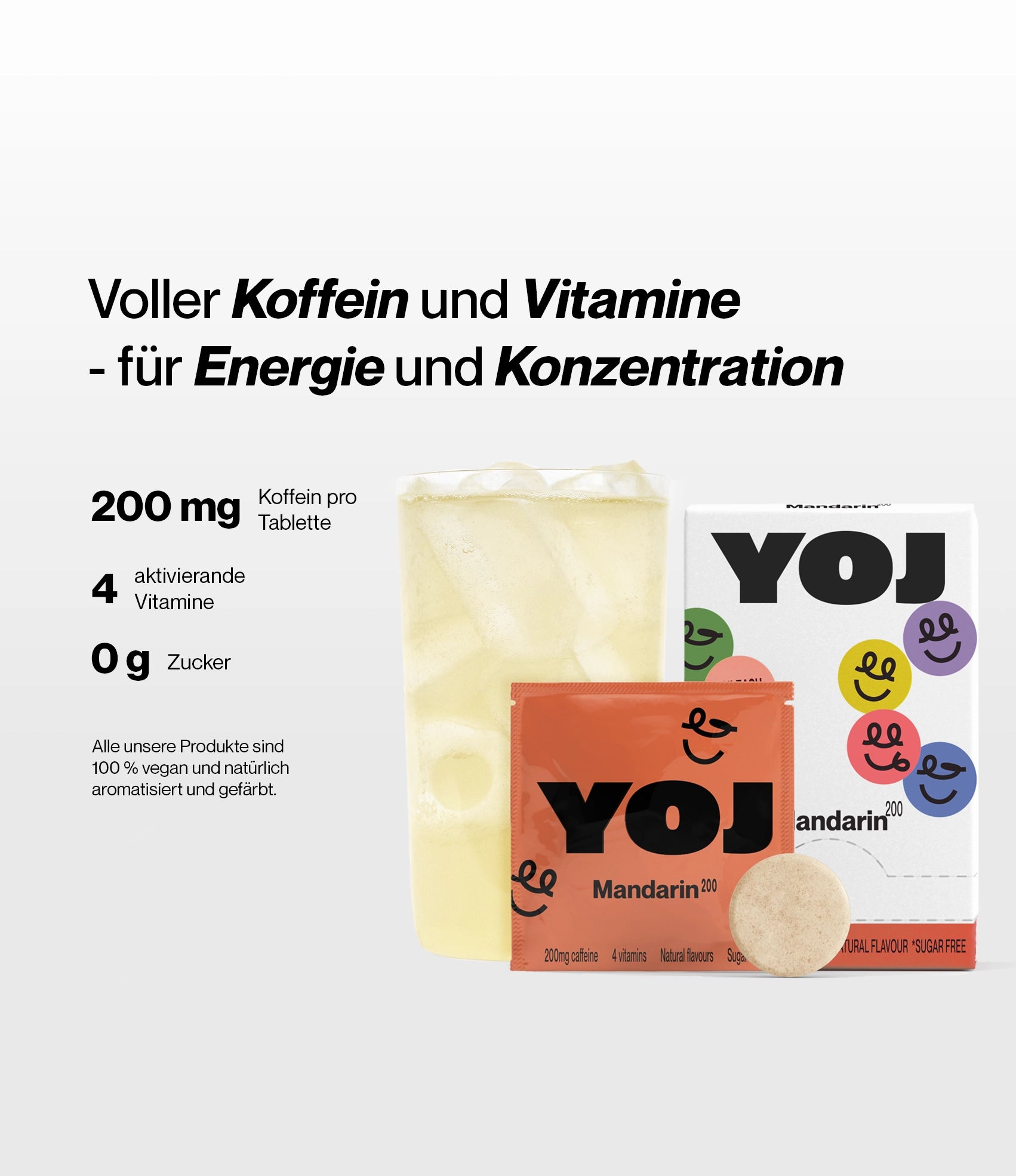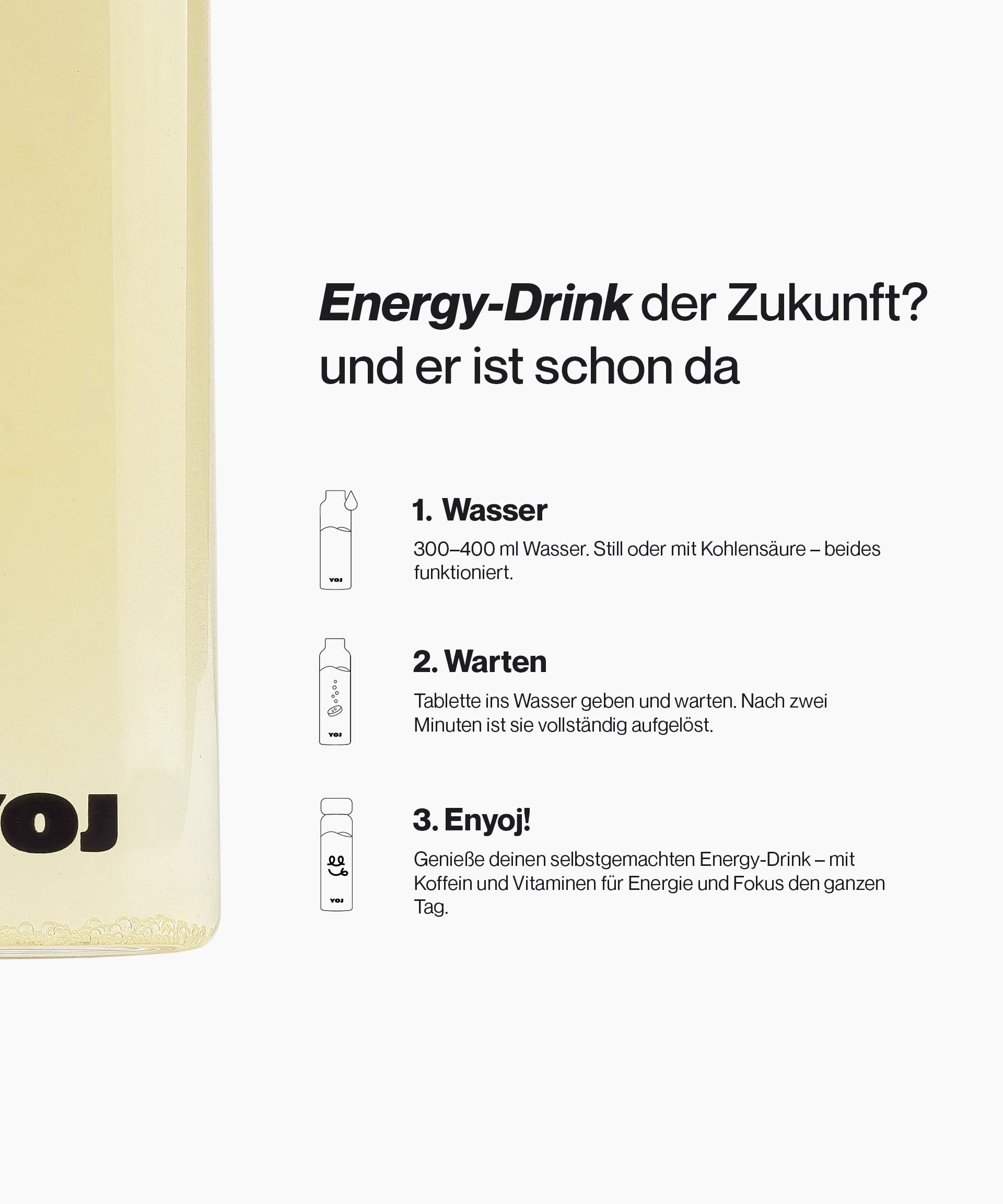 YOJ ist eine nachhaltige Alternative für alle, die einen Energieschub suchen, ohne die Umwelt zu belasten. Energydrinks werden oft in Aluminiumdosen verkauft, deren Herstellung, Transport und Recycling viel Energie und Ressourcen erfordern. Unsere Brausetabletten hingegen sind kompakt und leicht zu transportieren, was zu einer deutlich geringeren Umweltbelastung führt.